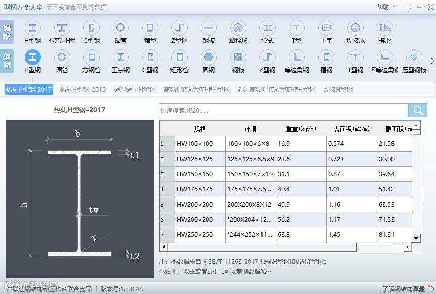 使用方法:按类型选择不同规格搜索,即可看到对应规格重量、表面积、截面积等结果