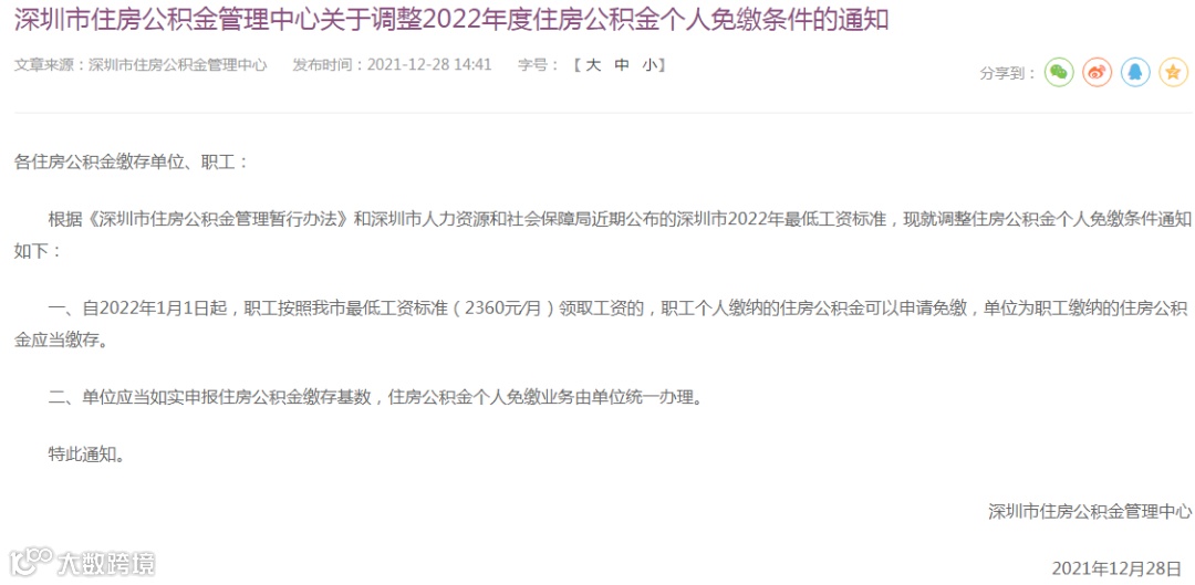自2022年1月1日起,职工按照深圳市最低工资标准(2360元∕月)领取工资的,职工个人缴纳的住房公积金可以申请免缴,单位为职工缴纳的住房公积金应当缴存; -