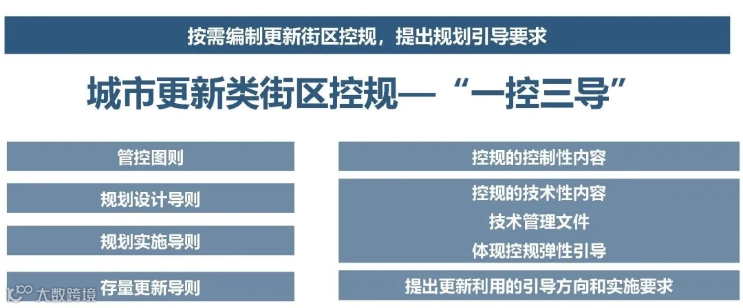存量更新导则:按类型梳理街区范围内闲置低效建筑和空间等存量资源的分布、功能、规模、权属等信息,提出更新利用的引导方向和实施要求等。