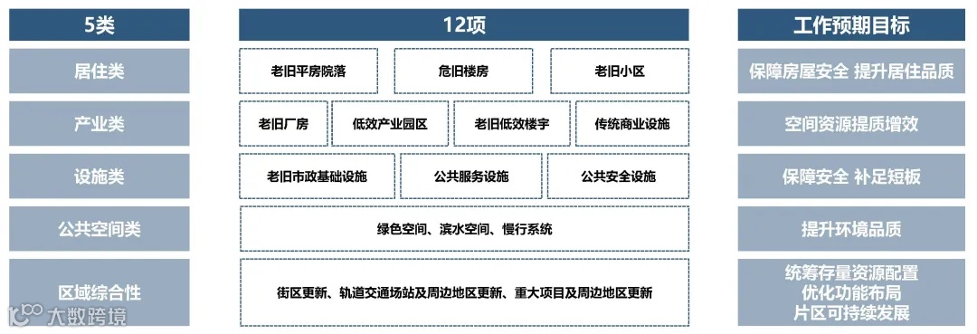 ①以保障老旧平房院落、危旧楼房、老旧小区等房屋安全,提升居住品质为主的居住类城市更新;
