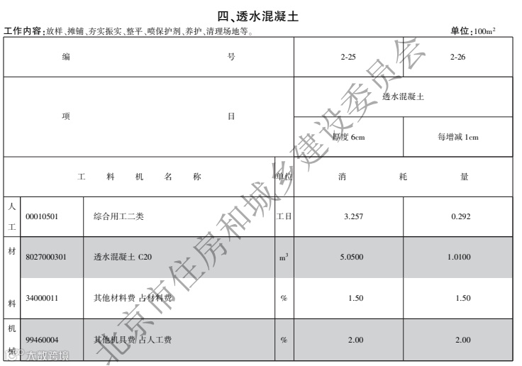 另外,最近各省市都出了新版定额,新版定额都增加了透水混凝土相应子目,编制招标控制价时应按定额执行,编制投标报价时可结合市场实际参照执行,如下图所示: