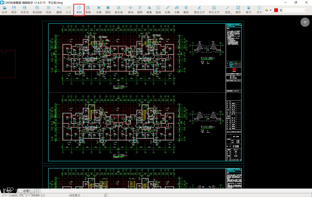 第二步:在平立剖图中选择工具栏的“复制”功能,点击左键拉框选择要复制的内容,右键完成(选择方式有两种:拉框 、直接点击选择单个图元)。