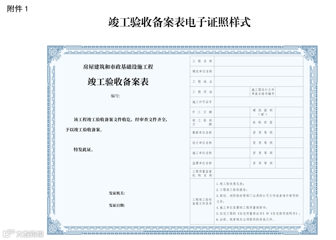 全省范围内的房屋建筑和市政基础设施工程项目在办理竣工验收备案时,全面实行电子证照(证照样式见附件1,标准板式见附件2)。