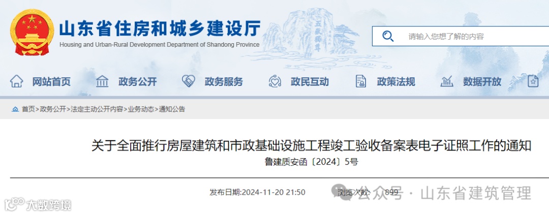 11月20日,山东省住建厅发布《关于全面推行房屋建筑和市政基础设施工程竣工验收备案表电子证照工作的通知》。