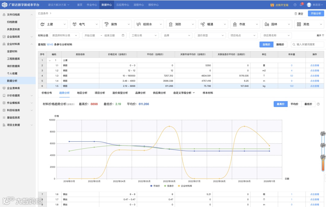 在清单编制版块,将上述数据中心与作业中心实现关联,便于直接调用基准价,实现归档数据的快速复用等。当然,无论是与广材网数据连通,还是对标审核、指标分析、快速生成多种清单等,均源于建筑企业痛点。
