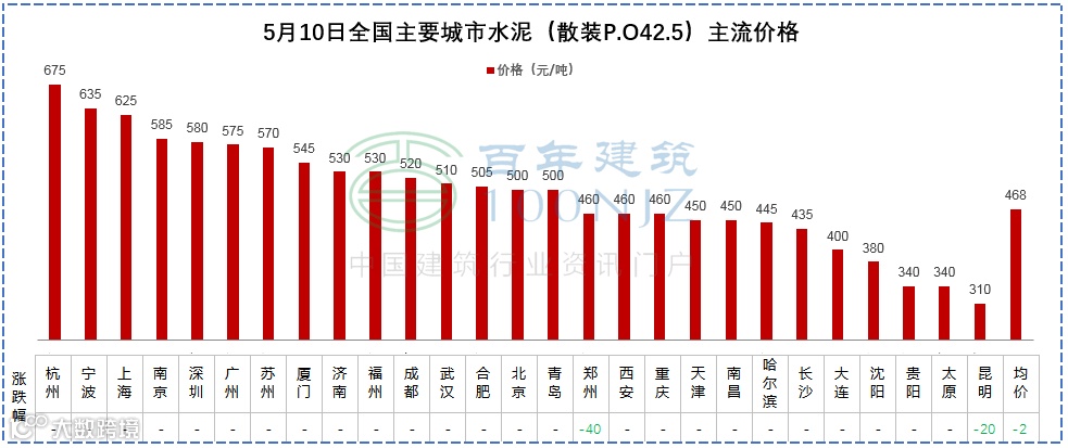 5月10日水泥价格指数512.48,日环比下降0.2%,全国26个主要城市P.O42.5散装水泥均价468元/吨,较上个交易日下跌2元/吨。重点城市:北京480-500元/吨;上海575-626元/吨;广州540-560元/吨;西安420-430元/吨。