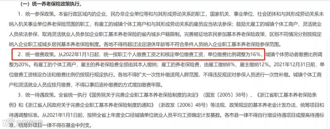 2021年年底,浙江省发布关于统一企业职工基本养老保险缴费政策的规定,明确从2022年1月1日起,统一按职工个人缴费工资之和核定单位缴费工资,单位缴费比例调整为16%,城镇个体劳动者缴费比例调整为20%。有雇工的个体工商户,雇主的养老保险费全部由其本人缴纳;雇工的养老保险费,由雇工缴纳8%、雇主缴纳12%。