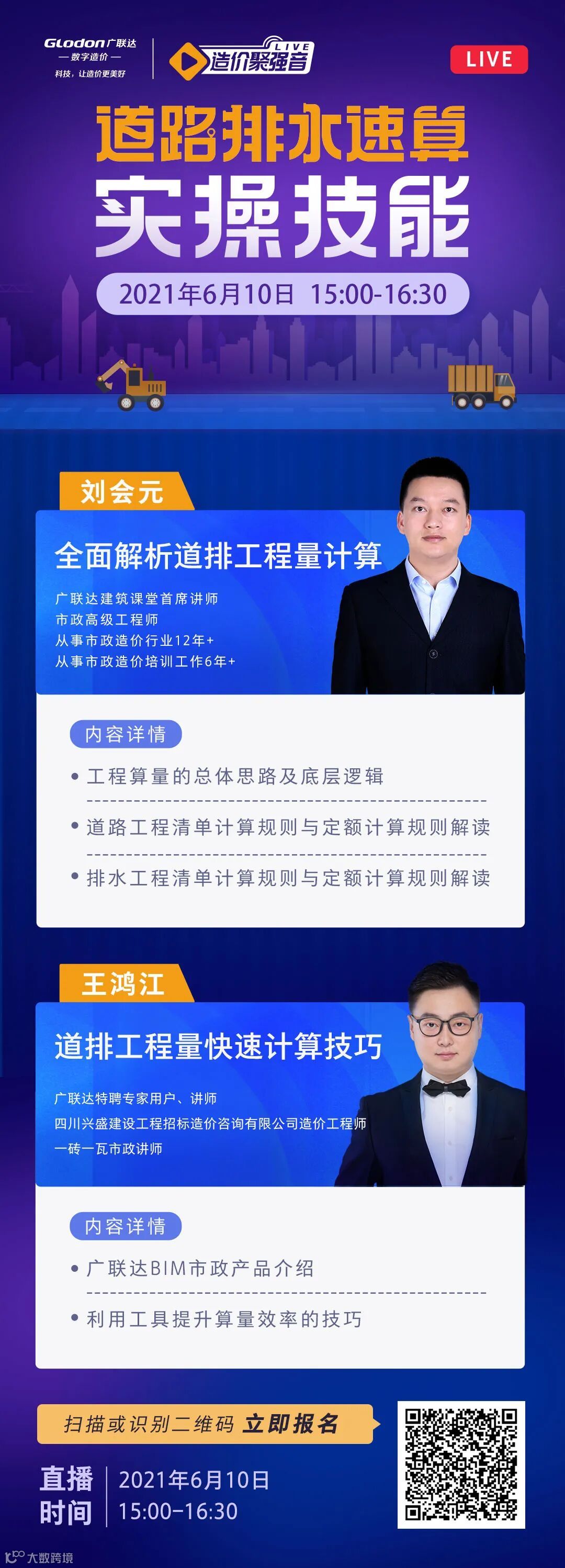 为了帮助大家更快速的掌握以上4点,提升市政造价工作人员的算量能力和效率,广联达数字造价6月10日下午15点特邀从业市政造价工作10余年的专家用户刘会元老师和王鸿江老师为大家全方位直播讲解市政道路和排水专业速算实操技能。