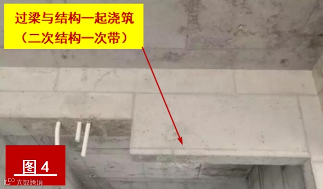 二、与结构一起浇筑法:与主体结构一起浇筑,工地俗语:二次结构一次带。这种方法,除了门垛外,很多时候,一些过梁也采用该方法施工。(见图3、4)