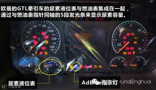 欧曼的GTL牵引车的尿素液位指示表采用数段式显示,该表与燃油表集成在一起,燃油量通过指针显示,尿素液位则通过与燃油表指针同轴的5段发光条来显示。同时在该仪表的中部下方还有蓝色的ADBLUE指示灯。