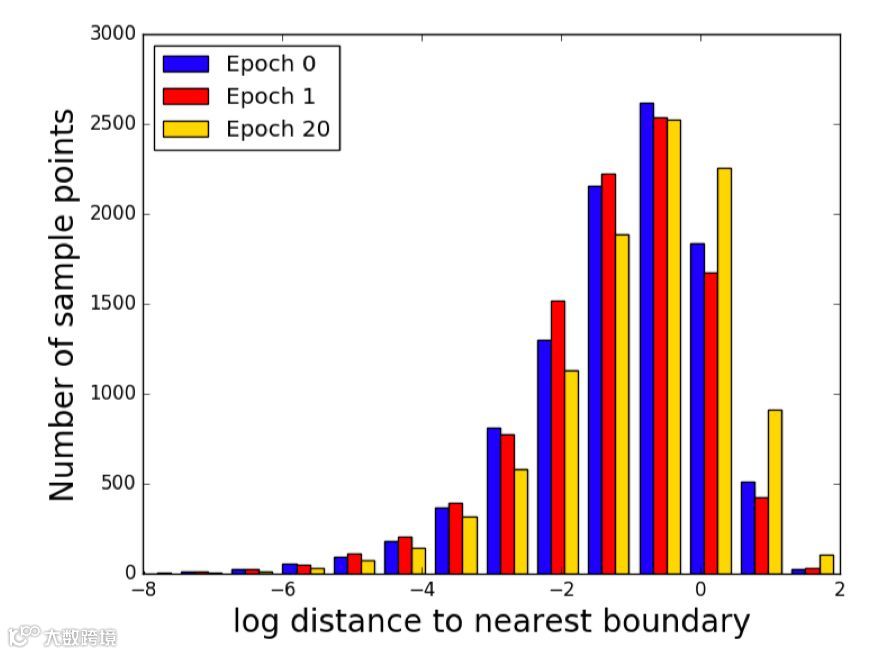 文章进一步将实际多个输入数据的最短距离做分布图,如下。可见,在训练过程中,该分布并明显变化。