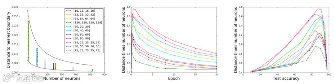 在多维空间时,文章利用MNIST数据,得到验证结果如下图:即所有网络,在训练的任何过程中,都有其神经元个数和最短距离之积的期望为近似常数。