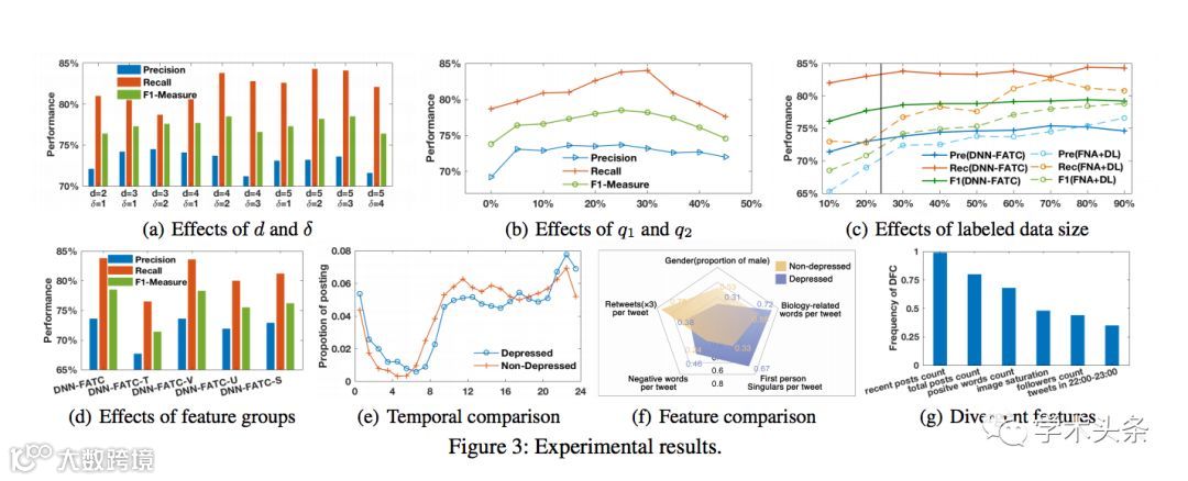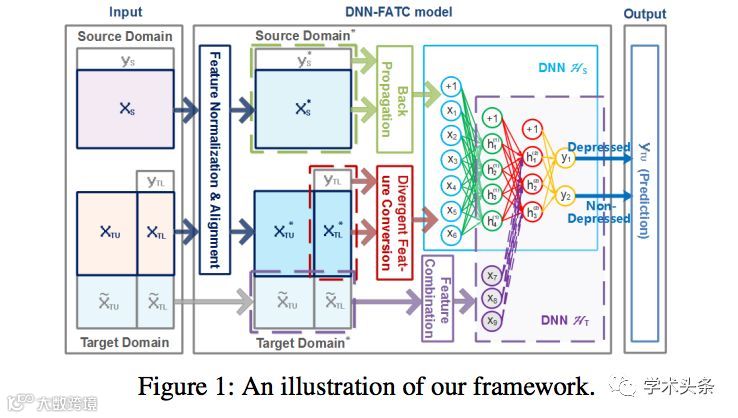 该论文通过社交网络例如Twitter、微博等社交网络平台的数据探测抑郁症人群。该论文首先系统地分析了跨领域的抑郁症相关特征模式,并总结了两个主要的检测挑战,即异构性和发散性。同时提出了一个带有特征自适应变换和组合策略的交叉领域的深度神经网络模型——DNN-FATC,来实现跨异构域传递相关信息。实验显示,与现有的异构迁移方法或直接在目标域进行训练相比该模型方法F1值提高了3.4%以上。
