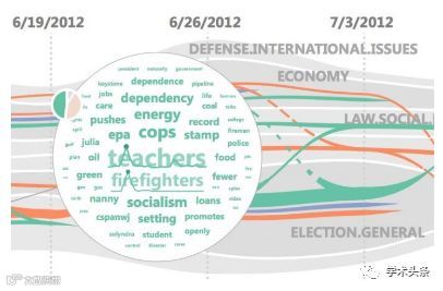 为了便于可视化分析,引入流式可视化,用以说明每个主题的竞争力随时间的变化。并展示出促进或降低主题传播行为被可视化为线程,这表明他们的角色随着时间的推移而变化。从不同的角度展示社交媒体用户群体之间的合作与竞争行为。 |