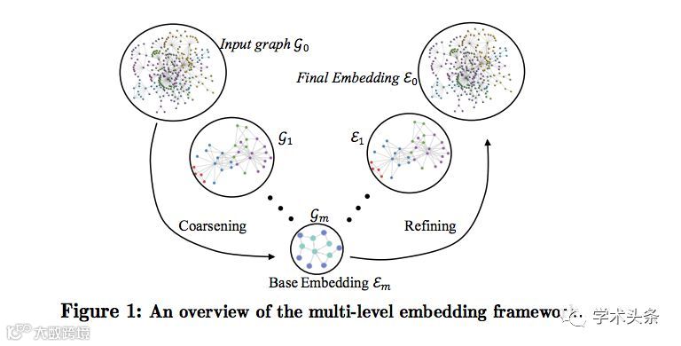 该论文提出了一种Multi-Level Embedding Framework(MILE)。该框架在进行Graph Coarsening时使用的是Structural Equivalence Matching(SEM)和Normalized Heavy Edge Matching(NHEM)。SEM会匹配那些邻居完全相同的点对,NHEM根据归一化的边权大小来匹配。与HARP最大的不同之处在于MILE只在最后一个level(即Coarsest Graph)上用现有的Graph Embedding方法来学一个Base Embedding。其余level的Embedding根据一个多层的图卷积神经网络从 Base Embedding 开始Refine得到。这样做的一个最直接的好处就是时间、空间效率会有大幅提升,因为只需要在Coarsest Graph上学Embedding。图卷积神经网络的参数在level之间是共享的,并且是根据Base Embedding来学的(有点trick)。
