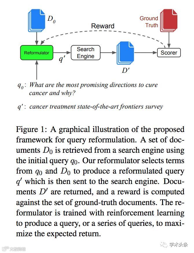 本文介绍了一个基于神经网络的查询重构(query reformulation)系统,帮助搜索引擎返回更多与查询相关的文档。作者使用强化学习的框架解决查询重构问题,其目标是训练一个可以根据搜索引擎的反馈学习如何对原始查询进行扩写的查询重构模型。扩写过程中候选的词语构成强化学习中的行动空间,搜索引擎返回结果的召回率作为学习的奖励信号,模型的训练过程使用了REINFORCE算法。