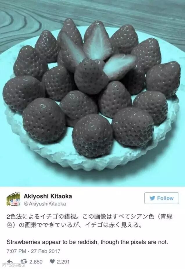 这其实是一种“颜色恒常性”的现象,因为人类的大脑有条件反射,会把草莓和“红色”联系起来,拒绝看到“灰色”的草莓。
