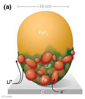 下图展示了转化反应是如何在氟化亚铁粒子中发生的:迁移率更高的氟离子从氟化亚铁粒子中扩散出来,与锂离子结合成氟化锂;亚铁离子与电子结合,形成纳米尺度的铁单质。