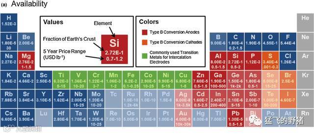 上图显示了各种金属元素的批发价格和其在地壳中的含量。即便电极不单单由金属制成,这些价格也具有相对的参考价值。比如,锰比钴便宜很多,意味着锰材料电极比起钴材料电极成本更低。元素的储量代表着可用量的极限。虽说实际可用量还取决于供应和需求,上图还是展现了一些元素的优点。举个例子,比起氮族其他导电性更好的元素,磷的储量更多。对硫来说同理。另外,通过与锂进行转化反应,得到了各元素的单位质量/体积电容量,如下图所示。