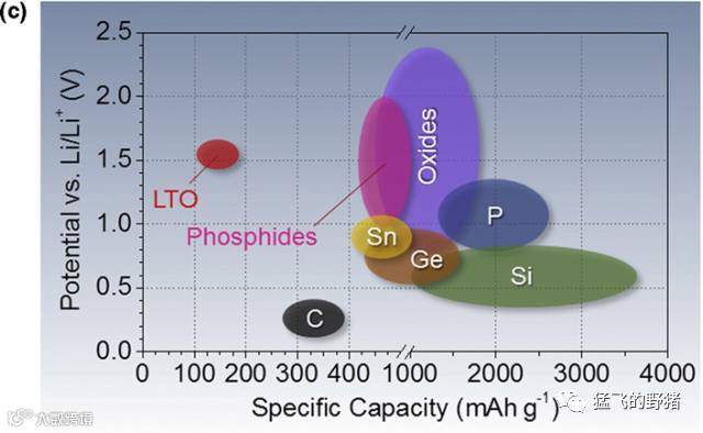 在这里,“合金材料”是指一些元素,在低电位下(最好低于1V),通过电化学反应和锂结合成化合物,如上面的反应式所示。合金材料有着极高的单位质量/体积电容量,但高达好几倍的巨大体积变化是其众所周知的缺点。