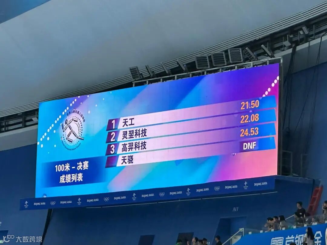 100米短跑是本次运动会上参赛选手最多、竞争最激烈的项目,共有23组90位机器人选手参加预赛。竞争异常激烈,最终仅4支队伍进入决赛。