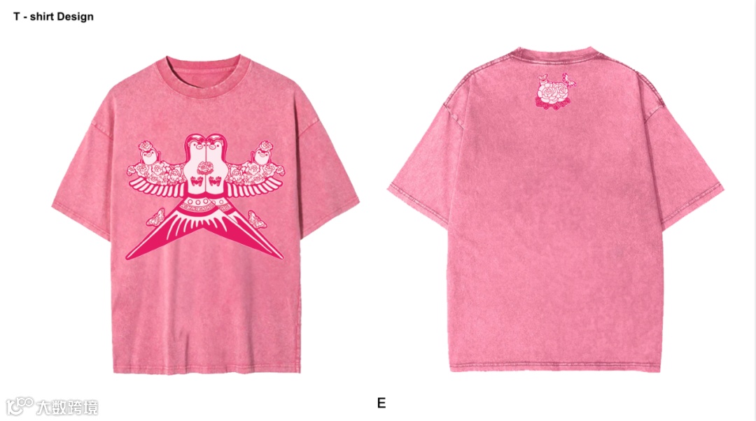 PUPU 抓着一朵双头牡丹花,呼应了《长恨歌》同一联的下句“在地愿为连理枝”的典故。牡丹有富贵之意,加上翅上的花丛与蝴蝶,更有春意盎然的氛围,结合T-shirt 设计童趣与典故共鸣,传统与潮流交融。