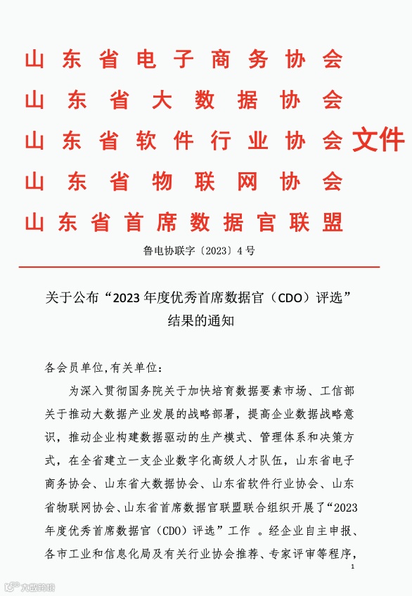 近日,山东省电子商务协会、山东省大数据协会、山东省软件行业协会、山东省物联网协会、山东省首席数据官联盟共同组织开展了“2023年度山东省优秀首席数据官(CDO)评选”活动,华方智联研究院院长申海亭荣获“2023年度山东省优秀首席数据官(CDO)”称号。