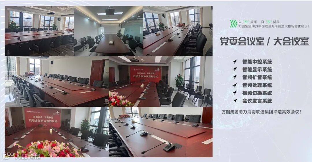 中国联通海南智慧大厦的建成寓意着将成为“中国联通产业互联网基地”,为海南提供业界领先的产业互联网基础设施,助力联通公司以更高的站位引领5G建设,进一步加快“数字海南、智慧海口”建设进程。方图FionTu舞台灯光系统、无纸化会议系统、会议发言系统、专业扩声系统、视频矩阵切换系统、智能中控系统、音频处理系统等定制化产品为中国联通海南智慧大厦新建工程(一期)提供最优质的软硬件支撑。方图FionTu定制化场景应用解决方案以创新、智慧、共享、绿色等元素融入中国联通海南智慧大厦中,以更高的起点推进网络强省、信息化强省战略布局,助力海南联通以高起点、高品质、高标准服务建设。