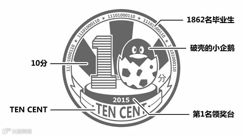 代表“十”的“0”是一个破壳的小企鹅,2015年腾讯有1862位校招毕业生,这个数字被转换成二进制写在印章的周围。