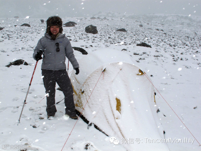 照片描述:搭好的帐篷一会儿就被雪埋了。中间要去扫帐篷上的雪,不然太重,压塌了。