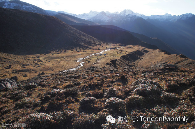 照片描述:河流远方的营地,队友们还刚刚早起。成蔟的高山杜鹃在晨光中质感分明。