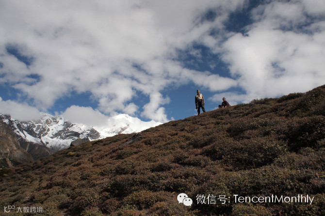 今天走得快点,没有吊在尾巴上。打珍虽然腿疼,但一个腿疼的藏族妇女,速度也是比我们快的。本来一起,走走停停。后来,坐在山坡上,看见天边的云涌过来。哎呀了一声,说不能把衣服打湿。就先走了,一会儿就消失在山脊线上,追前面的老公米玛去了。