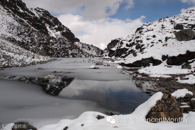 过了垭口,以为了去最大的挑战。然而直落1500米的高差下坡,泥雪,把之前的松快心情消磨殆尽。走了5个小时,几走成雪盲,看到此湖,命名为“绝望の湖”。只有尽快走过白色大地,往下还有绵绵山谷,今晚营地,远在其中不知处。