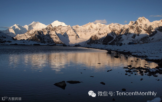 昨日被迷雾封印的群山,一致现身。晨光为依次为三位王者点亮金顶。从左至右,分别是马卡鲁(Makalu,海拔8463米,世界第五高峰),洛子峰(Lhotse,海拔8516米,世界第四高峰),珠穆朗玛峰(Qomolangma,世界第一)。
