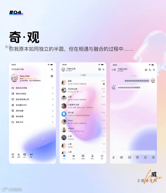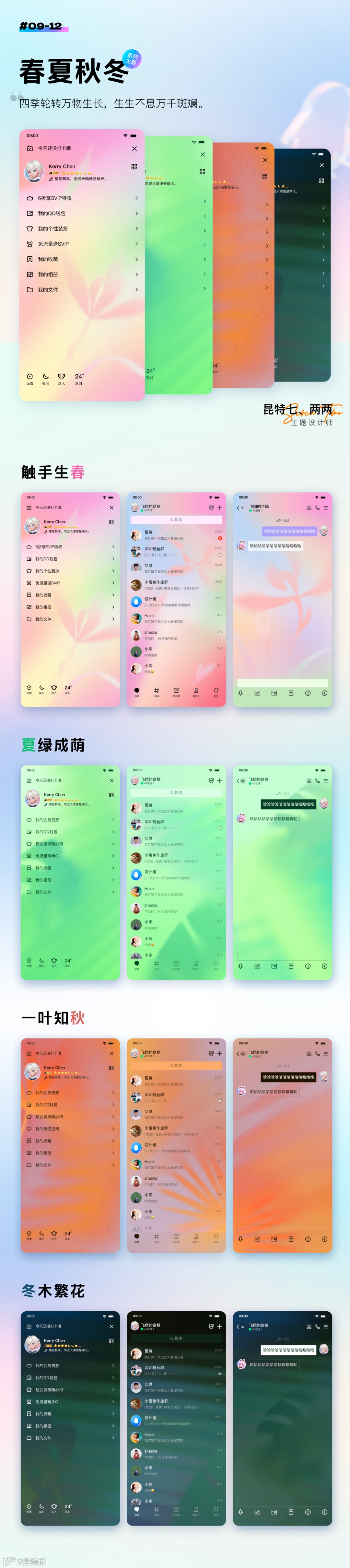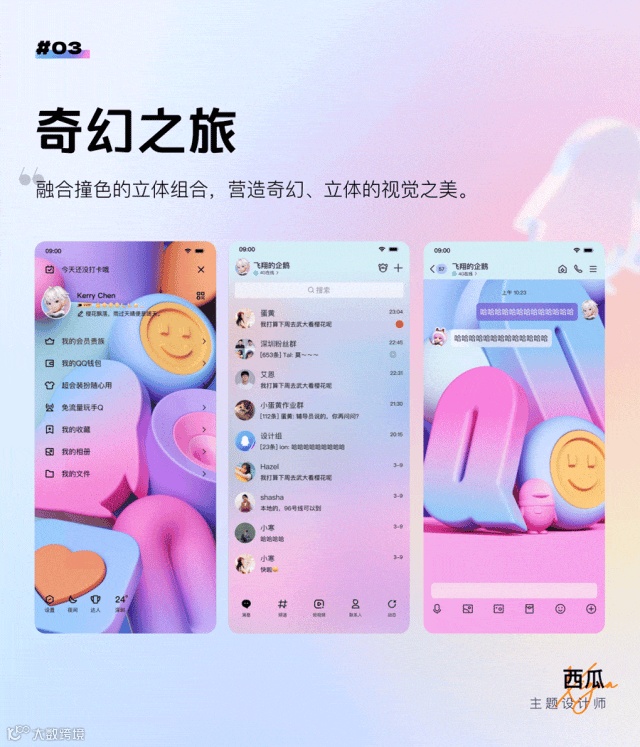 另一方面,QQ9也是兼容并包,个性化和娱乐化的,而QQ皮肤主题一直是QQ用户彰显个人身份和审美的重要途径,这次我们联动8位优秀设计师,以多巴胺为主题,设计了12套精美限定皮肤主题。