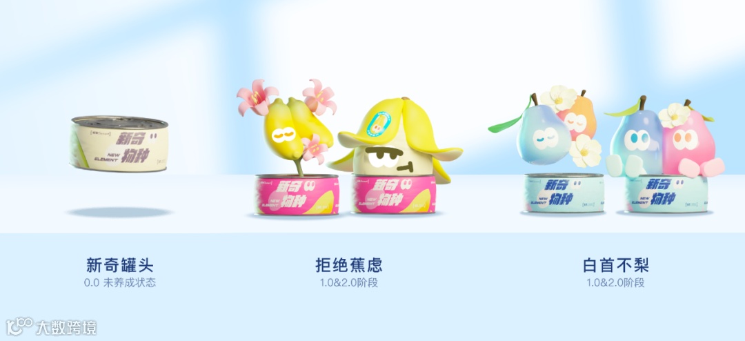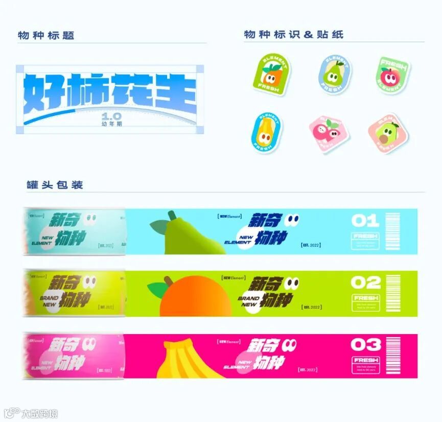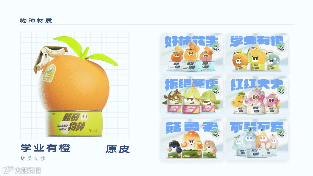 同时,在物种的幼年时期,如果只是出现物种幼年形态,物种之间差异性较小。为此,在第一期的果蔬类物种中,我们在第一和第二阶段规范化使用了「新奇罐头」这个容器,根据不同的物种设计不同的罐头包装,目的是再一次强化品牌符号,且拉开物种之间差异性。