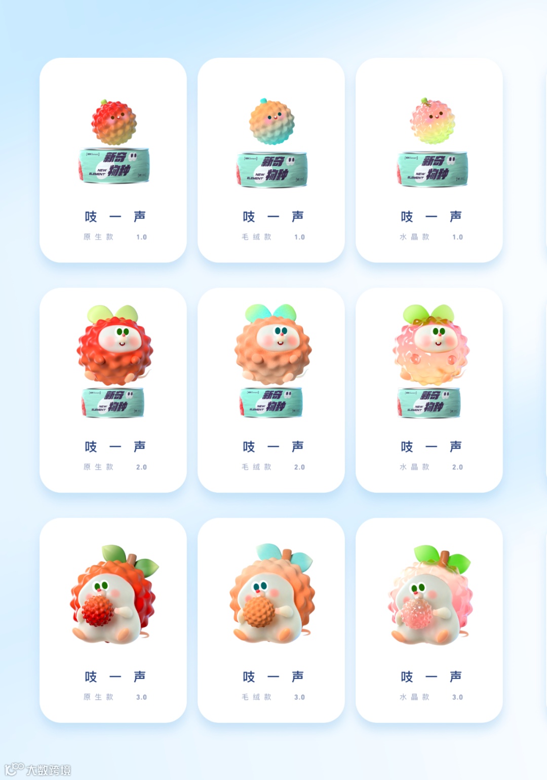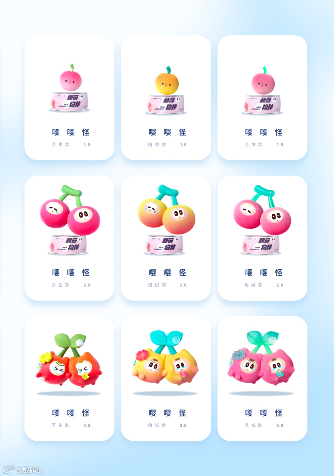 我们将物种的本身材质作为物种的基础款式之外,还在基础上设计产出了每个物种的特别款,供用户抽取收集。再最初的规划中,我们创新的设定了 金属,水晶,岩石,针织款等材质。在项目最初灰度测试阶段,我们发现毛绒款收到用户青睐好评远超预期,于是在每个水果的设计中我们都保留了毛绒材质的物种。同时,我们也会根据物种形态适合给予物种不同材质,完成特别款的设计。