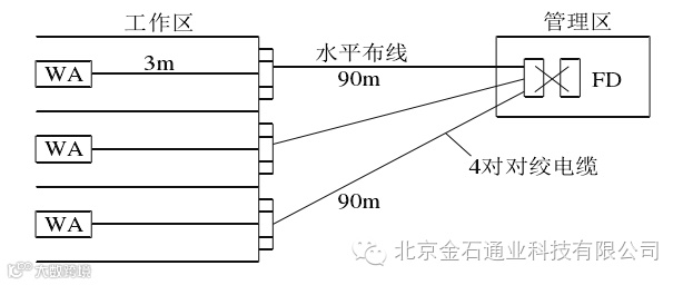 配线间的线缆管理采用六类非屏蔽 48/24 口,配线面板是 RJ45 面板,实际使用高度为 3U/2U。对于用户有高速率终端要求的场合 ( 如计算机房的服务器、贵宾室、研究室等 ) 可采用光纤直接布设到桌面。典型的配线子系统布线和工作区终端设备的连接如图3 所示。