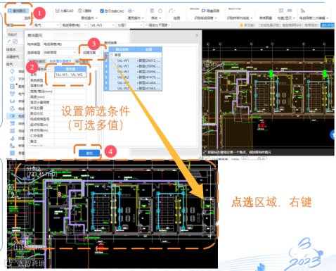 ● 筛量:支持按区域快速筛选工程量,工程量筛选支持场景更多样化,专业构件、查找图元、批量选择管、明细工程量-框选查量。