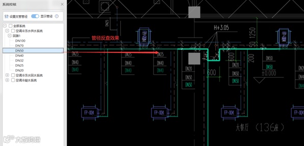 系统校核窗体中,系统、回路、管径节点均支持单击反查,可定位到绘图区所在位置,清晰直观。