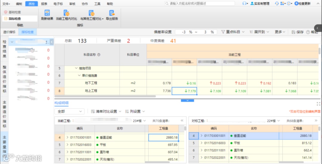 【立即体验】打开云计价进入质控-指标检查,即刻体验指标秒级计算,自动对比分析,全面识别量价偏差分析。