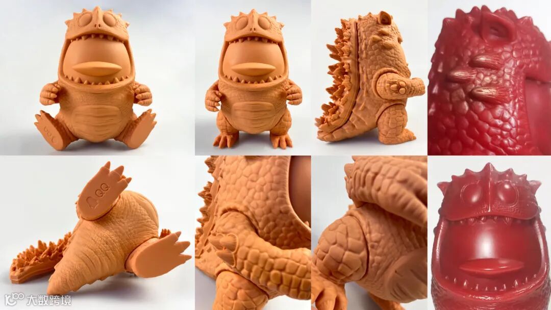 在保持哥是鹅原有的基本轮廓下,对于各个细节进行再设计。最直观的是对哥是鹅增加了鳞片设计,在进行鳞片雕刻时,我们参考了恐龙等怪兽的鳞片造型,鳞片的造型使得搪胶这种材料的优势更突出。同时为了更彰显怪兽的力量感,我们对爪子、脚部和尖角等关节进行了造型调整。将背脊的设计也调整的更为写实与粗旷,让新哥是鹅在整体造型上凸显出野性,细节上更巧妙更有质感。