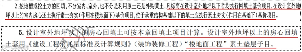 某省的规则与其异曲同工:设计室外地坪以下的房心回填土,按本章回填土项目计算。设计室外地坪以上的房心回填土套用“楼地面工程”中的素土垫层子目。(见下定额截图)