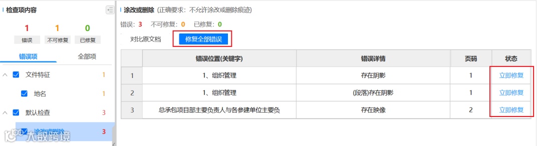 2、灵活选择修复内容,一键优化格式问题,一键去水印、超链接,快速完成高质量标书优化;