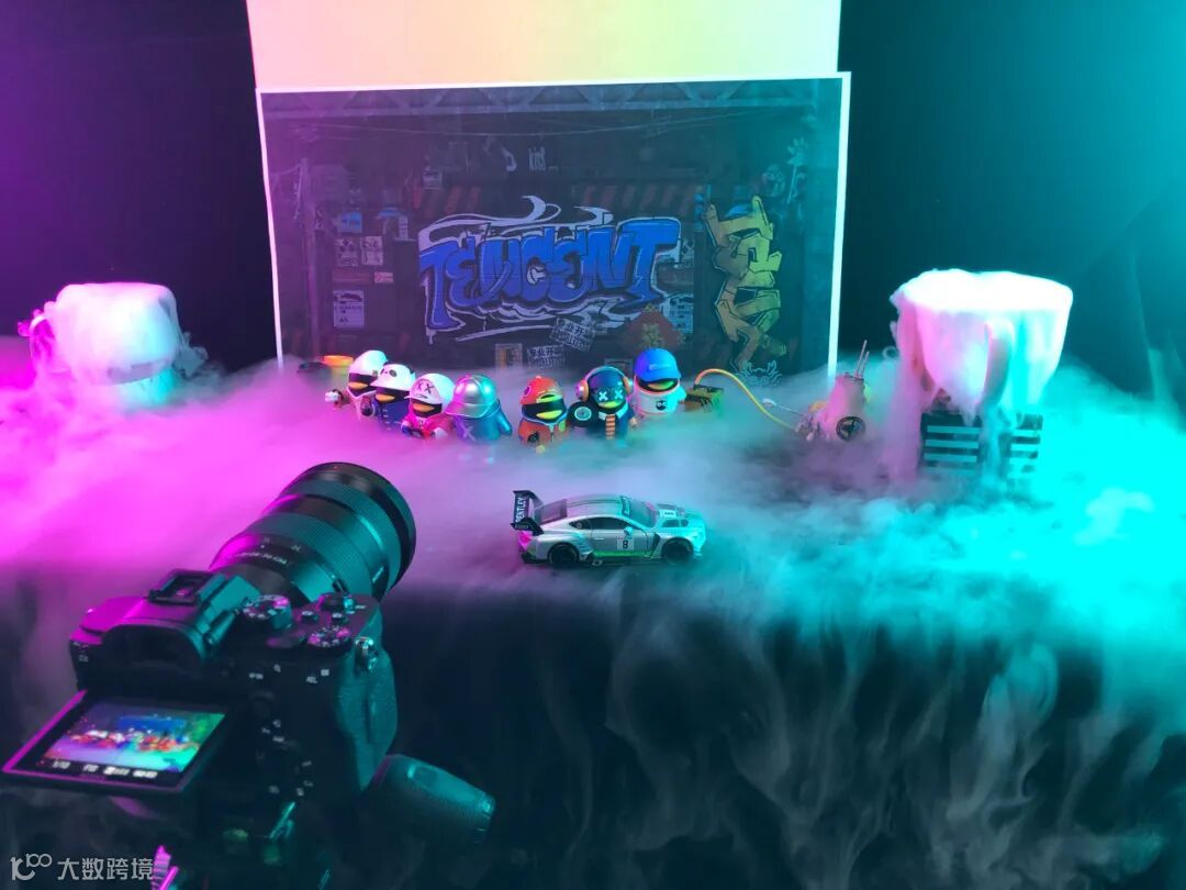本次摄影环境选择室内暗景棚拍,专门设计的彩打涂鸦背景暗藏TENCENT和ISUX字样,加上警示带和小广告,细节表现人物所在的街头场景。用沸水加干冰制造烟雾效果,加以红蓝霓虹撞色灯渲染,打造亦真亦幻的赛博朋克氛围。