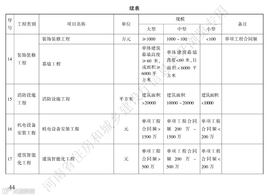 大型、中型、小型工程规模标准划分: