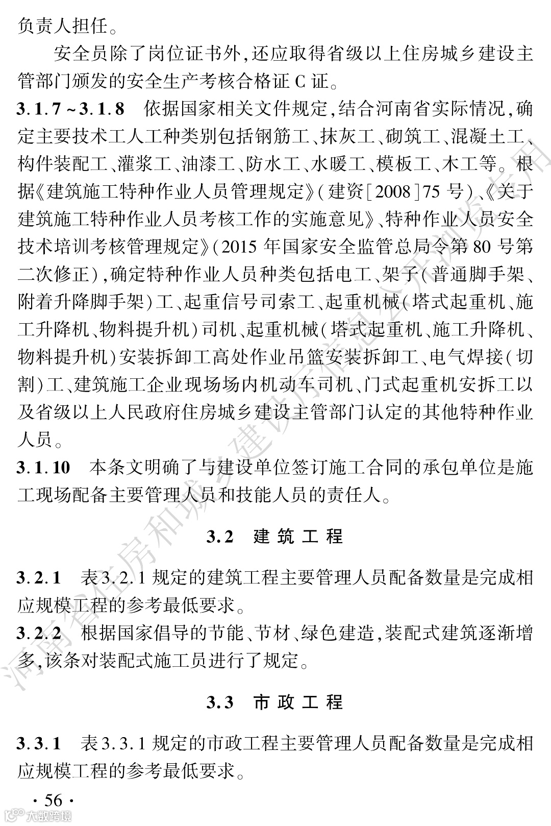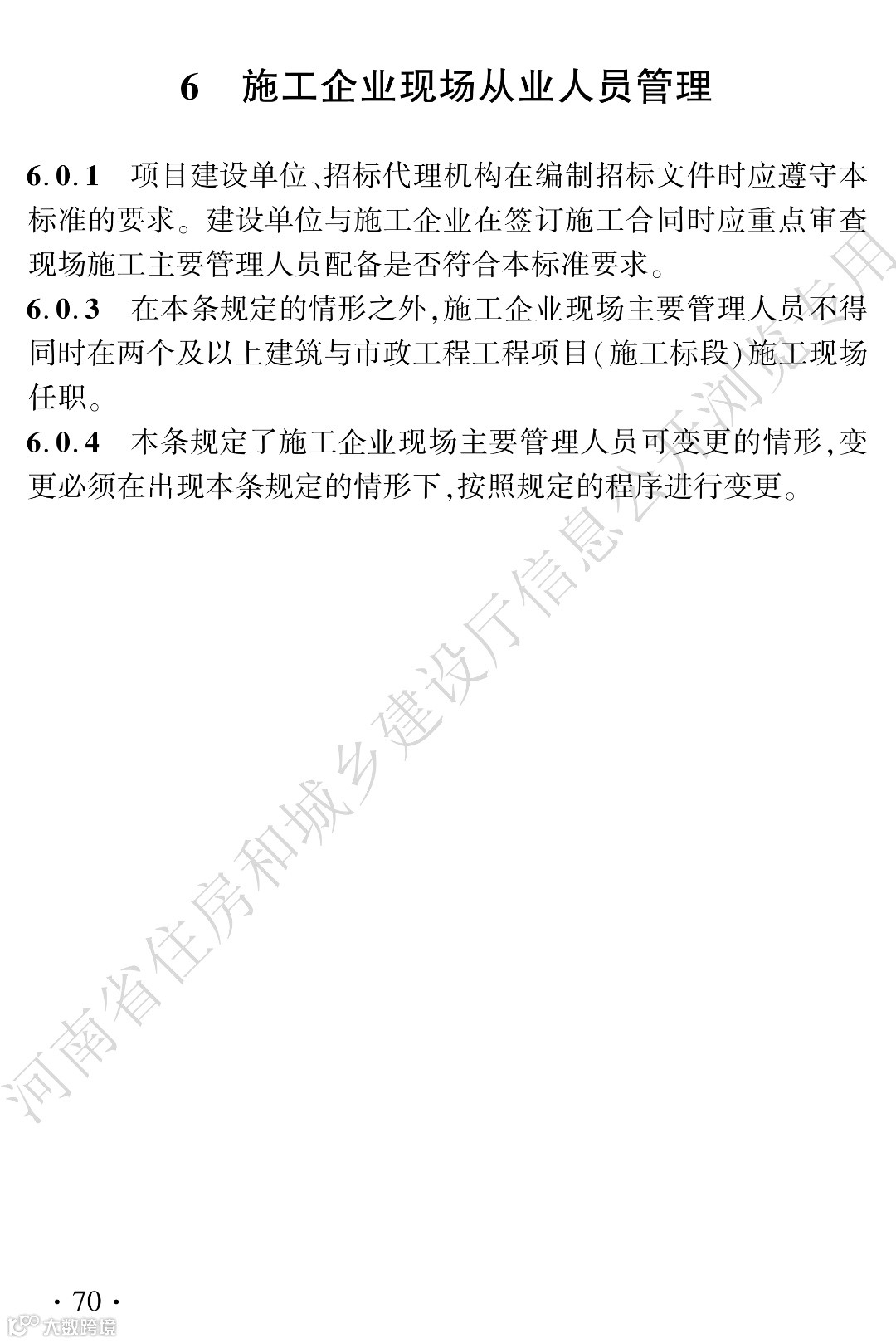 6.0.1建筑与市政工程建设单位或招标代理机构编制的招标文件中应明确要求投标人按照国家、河南省有关法律法规、规范和本标准配备施工企业现场主要管理人员,不得擅自降低标准。