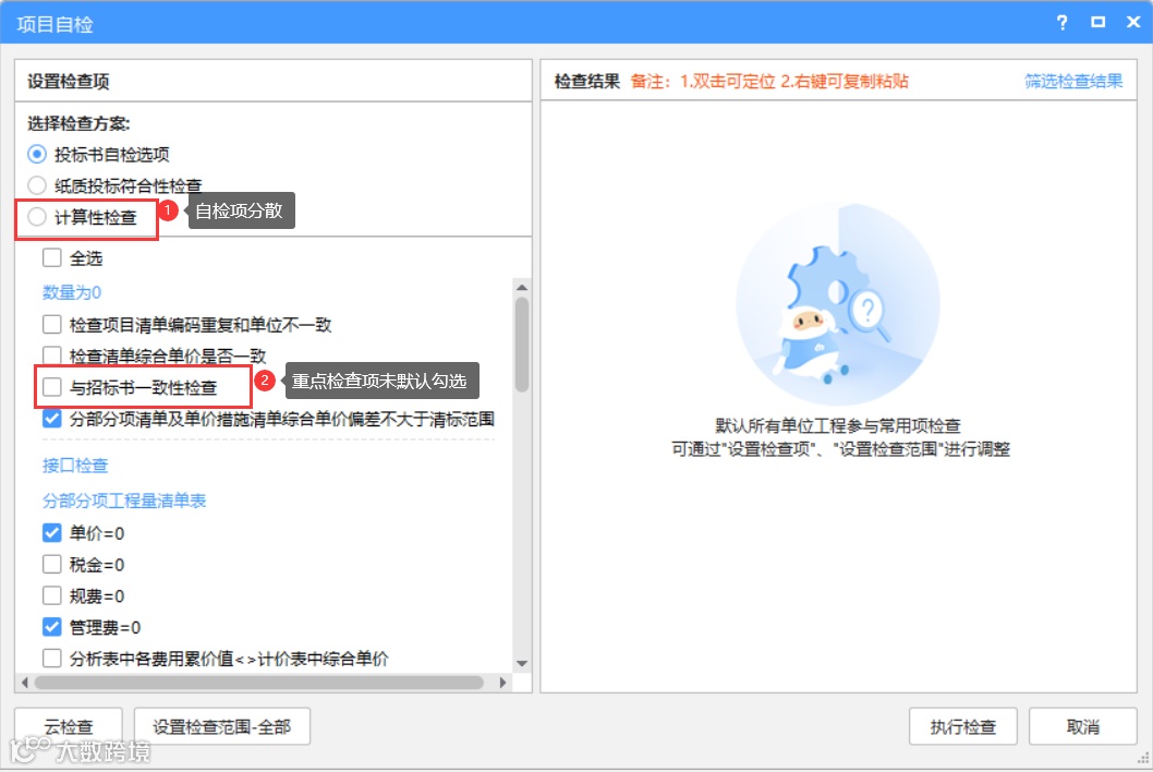 难点2:自检项分散、重点自检项未默认勾选,导致标书未做全面检查。