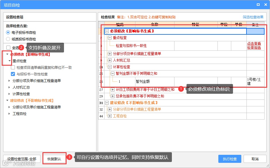 ③检查项及检查结果区分【必须修改】影响标书生成、【建议修改】不影响标书生成。