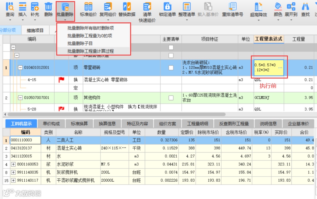 云计价6.0新功能:批量系列功能,新增批量删除工程量计算过程功能,支持单位、整个工程量计算式批量删除,且保留计算结果。
